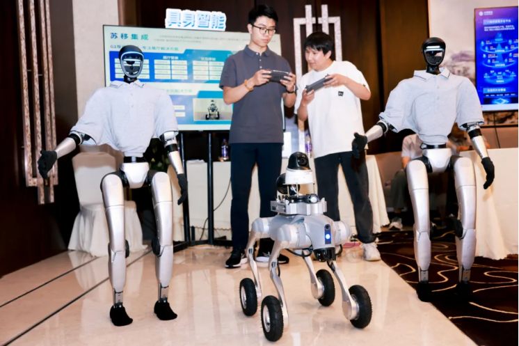 活动中,中国信息通信研究院人工智能研究所平台与工程部主任曹峰分享《生成式人工智能现状与发展趋势》专题报告;省人工智能学会理事长陈松灿、省通信管理局技能鉴定中心主任丁玮、省科协秘书长范银宏、中国移动江苏公司政企客户部副总经理藏昊旻共同发布江苏移动AI信息消费“新三样”。据了解,此次发布的新三样产品包含智能网联车、智能终端、智能机器人,全面覆盖“人、车、家”场景。其中,具身智能机器人包括人形/轮式机器人和机器狗,服务于陪护、教育、接待等五大应用场景。