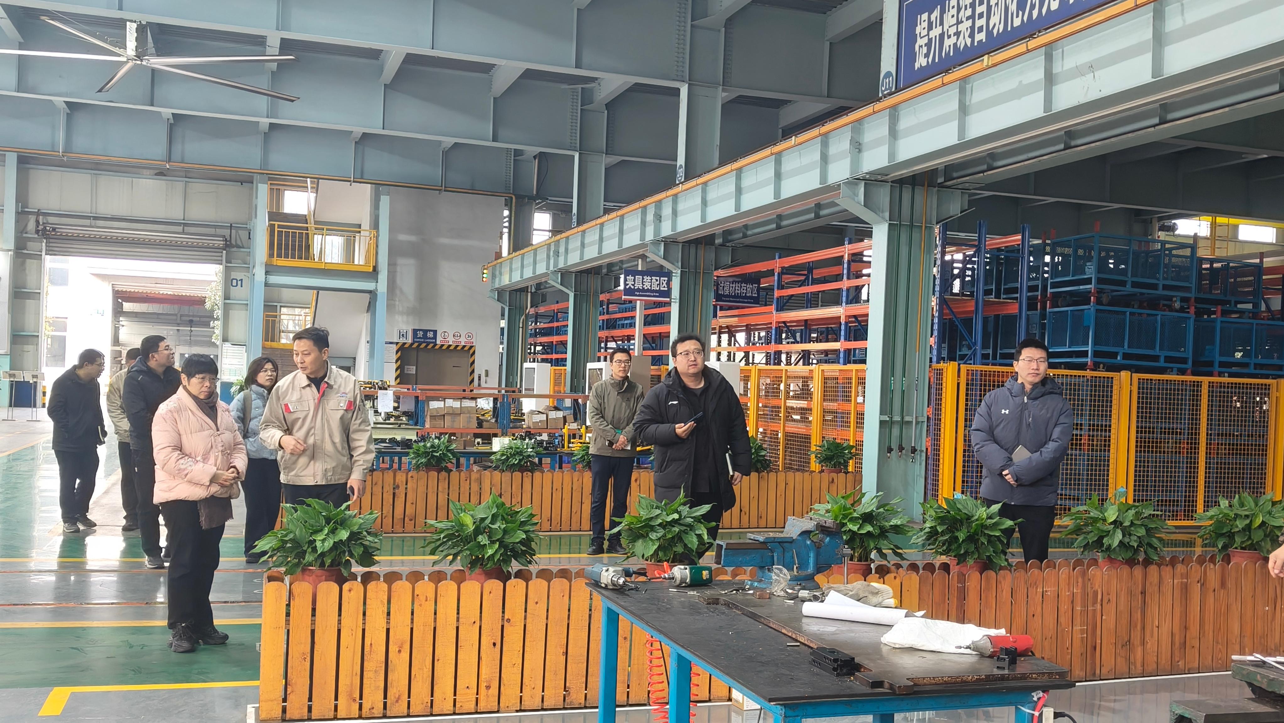 调研次日,专家团来到新程汽车工业有限公司。该企业是国内多家汽车制造商的重要零部件供应商,主营业务涵盖车身及轻量化零部件、工装制造自动化集成等。通过参观企业焊装自动化生产线,专家团实地观摩了其在夹具装配、试模材料存放等方面的智能化管理实践,系统了解了其从研发设计到模具、检具、夹具开发,再到机器人系统集成的全链条技术能力。