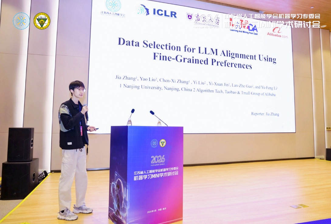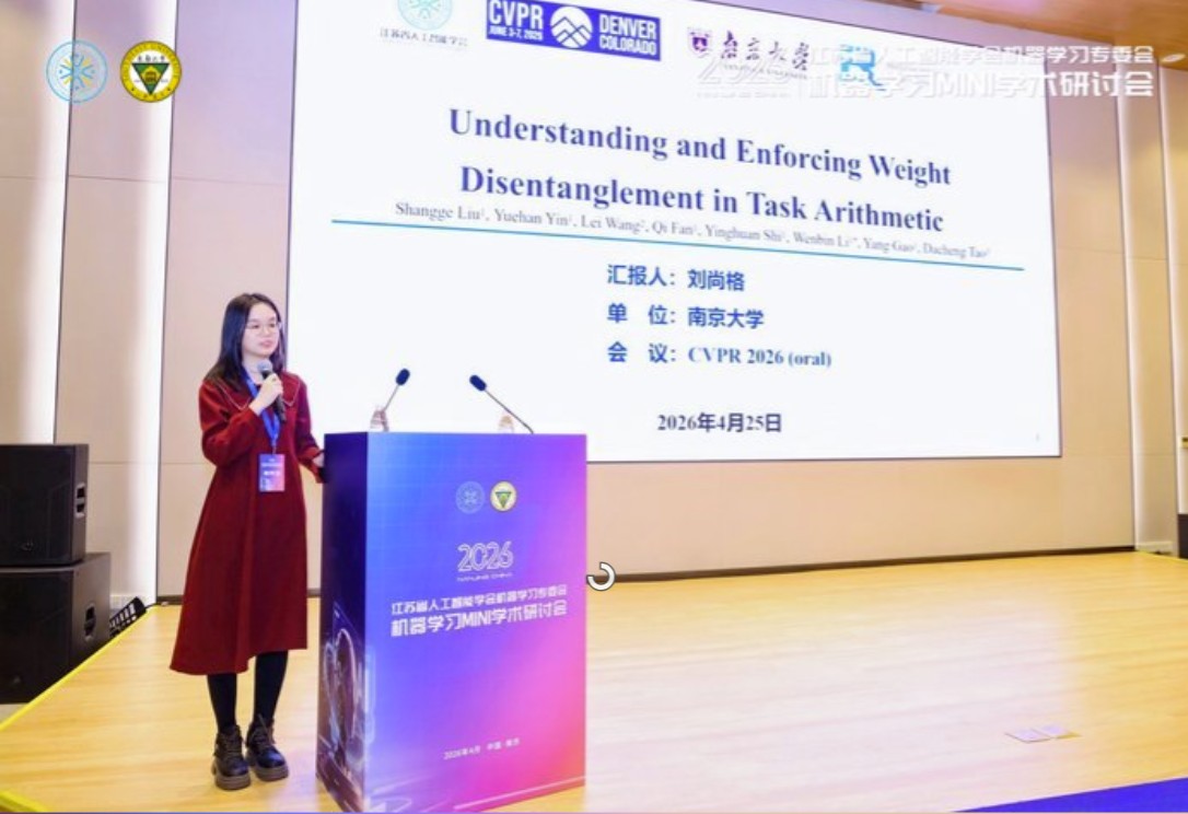 2026年4月25日,“2026年机器学习MINI学术研讨会”在南京溧水成功召开。本次研讨会由江苏省人工智能学会主办,江苏省人工智能学会机器学习专业委员会、东南大学计算机科学与工程学院、软件学院、人工智能学院、中国移动通信集团江苏有限公司南京分公司承办,江苏省人工智能学会女科技工作者委员会协办,旨在为省内机器学习及相关研究领域的学者交流最新研究成果、进行广泛的学术讨论提供便利,以机器学习理论与应用、计算机视觉、图学习、智能体等领域的新技术、新方法为主题,探讨机器学习领域相关理论与技术的最新研究与发展趋势,共同推动机器学习领域的繁荣和进步。