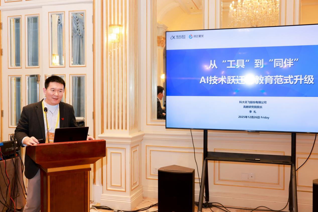 李礼院长的报告以“从工具到同伴,AI技术跃迁与教育范式升级”为题,首先从乌卡时代的不确定性切入,阐述了计算、连接、数据、智能四大数字技术的发展脉络,分析了人工智能对就业市场和人才需求的深刻影响,明确了创造力、同理心等人类核心特质的不可替代性,为AI与教育融合研究奠定了现实与理论基础。李院长随后分享了讯飞在AI +教育领域的实践进展。首先,在技术突破层面,构建了涵盖130余种语种、202种方言的语音识别与合成技术,攻克复杂图文、公式识别难题,星火大模型在国产算力支撑下实现接近顶尖水平的综合性能。其次,在教育应用层面,打造学科大模型生态,与多所高校合作构建食品、中医等专业模型,通过智慧教室、AI学习机等设备实现教学资源数字化沉淀。最后,在范式创新层面,提出“师-生-机”三元结构,推动教学从知识传递向能力提升转型,构建个性化学习、智能评价一体化的未来教育模式。报告特别强调,大模型时代教育面临机遇与挑战。一方面,AI的感知、推理能力为跨学科教学、个性化辅导提供了新可能;另一方面,大模型的客观真实性、自进化能力等短板仍需攻克。李院长指出,未来教育需以自主可控AI技术为基座,深化人机协同,聚焦学生核心素养培育,推动教育从技术叠加向范式升级跨越。