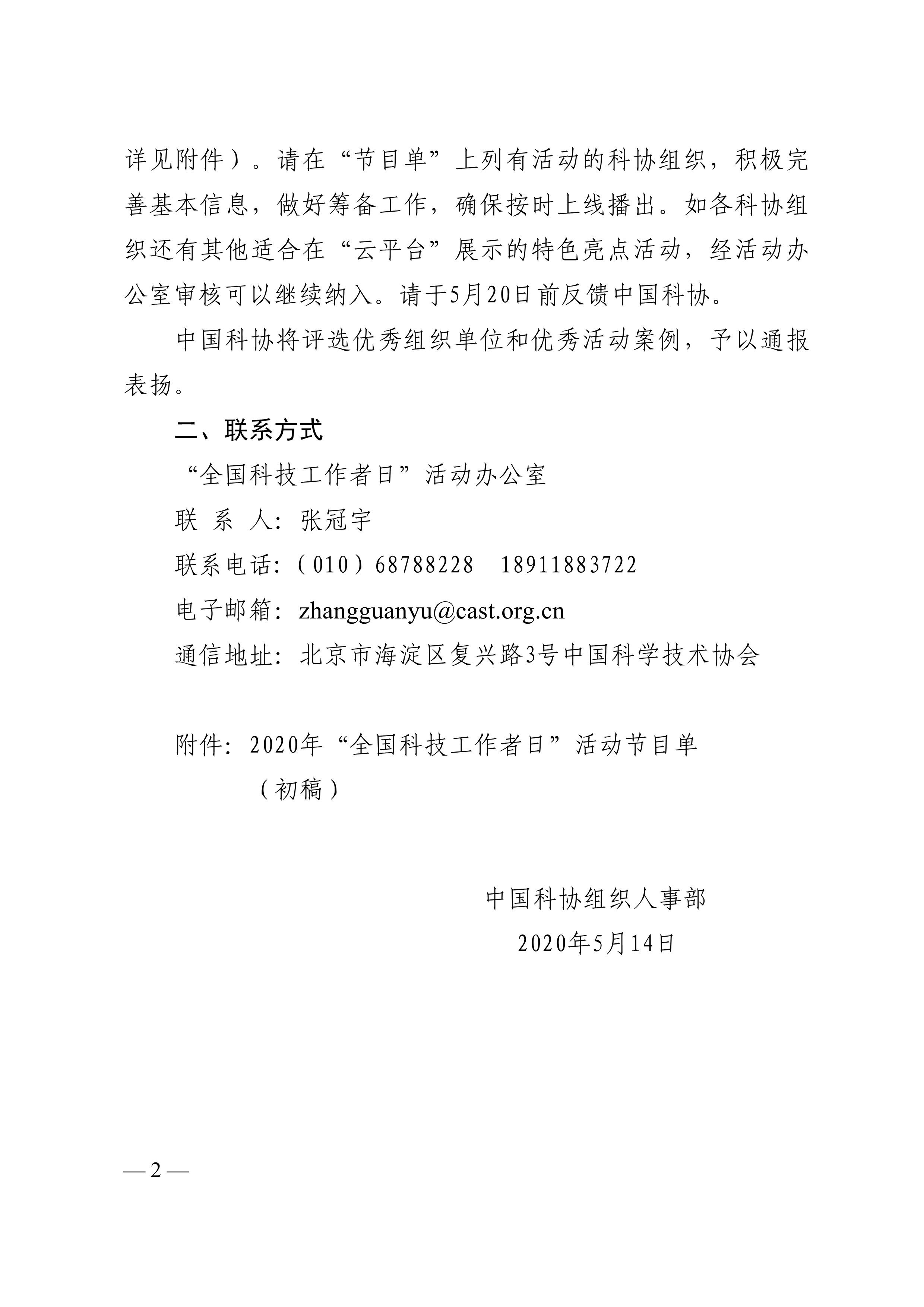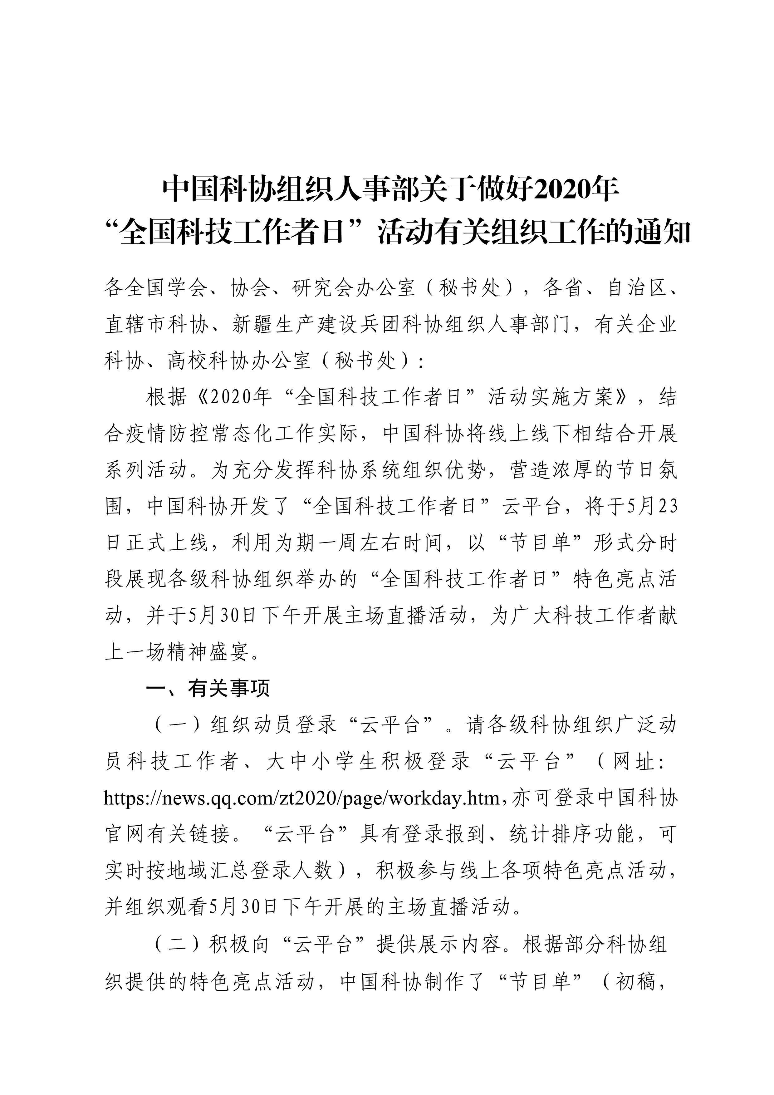 中国科协组织人事部关于做好2020年全国科技工作者日活动有关组织好工作的通知