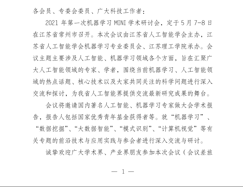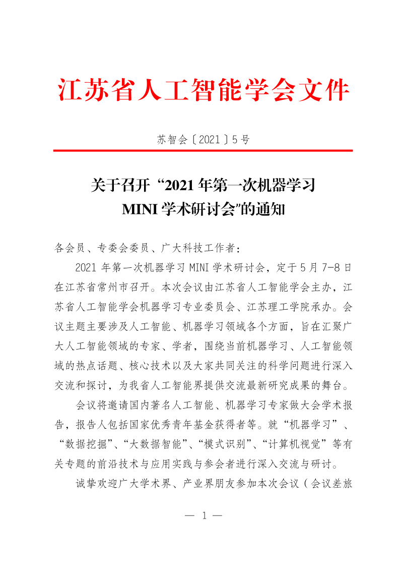 苏智会〔2021〕5号关于召开“2021年第一次机器学习MINI学术研讨会”的通知