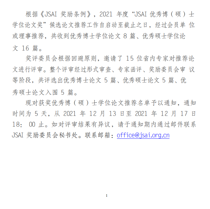 2021 年度江苏省人工智能学会(JSAI) 优秀博(硕)士学位论文推荐名单通知