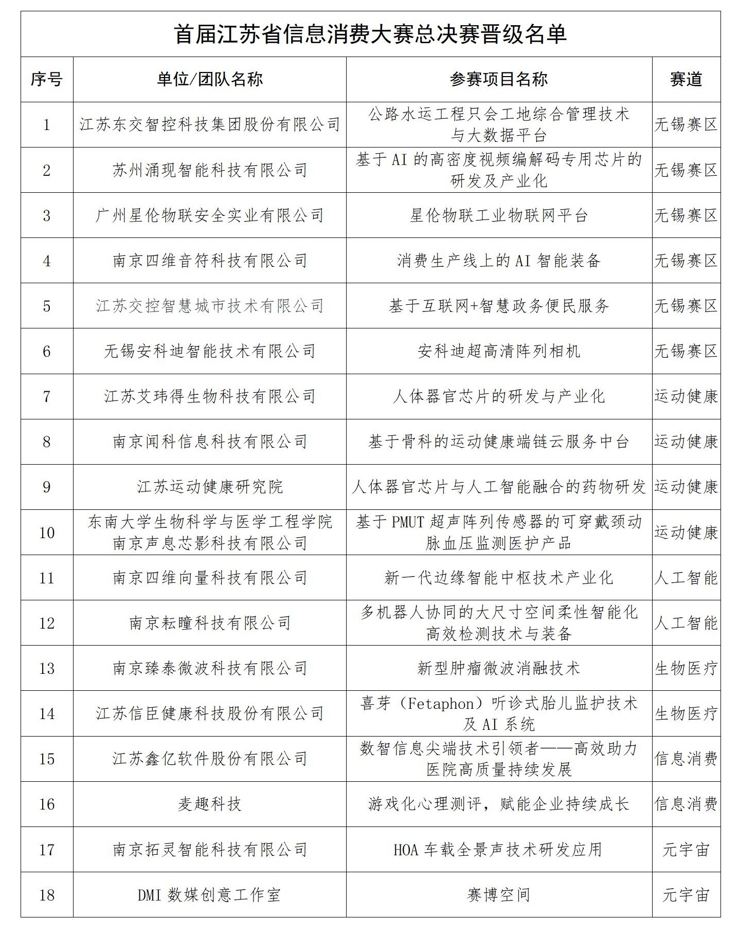 由江苏省工业和信息化厅主办,江苏省人工智能学会、中国信息消费联盟江苏分盟、无锡物联网创新促进中心、江苏省信息消费标准化委员会承办的首届江苏省信息消费大赛,在经过89只团队、6轮分赛的角逐后,共18只团队胜出进入总决赛,总决赛将于11月25日在无锡举行。 现对首届江苏省信息消费大赛晋级团队名单予以公示,公示时间为5天,从2022年11月20日至2022年11月25日18:00止。如对评审结果有异议,请于公示期内通过邮件联系 JSAI 秘书处。 联系邮箱:office@jsai.org.cn