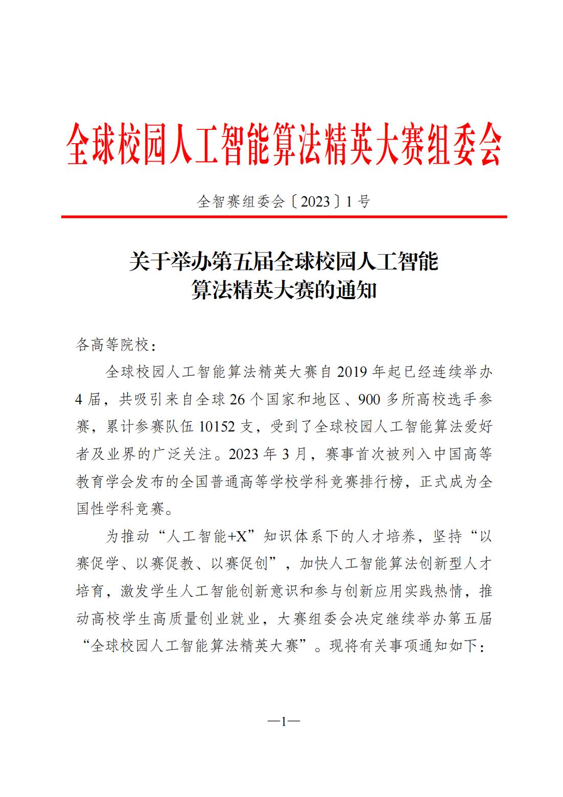 通知下载:关于举办第五届全球校园人工智能算法精英大赛的通知